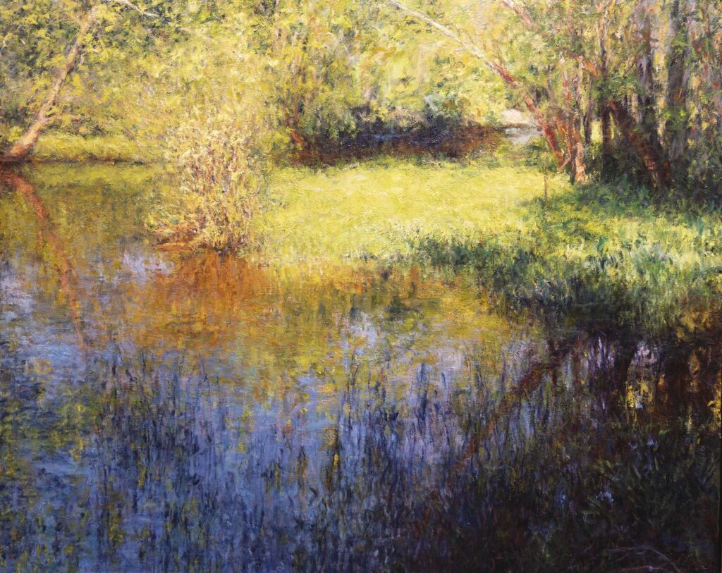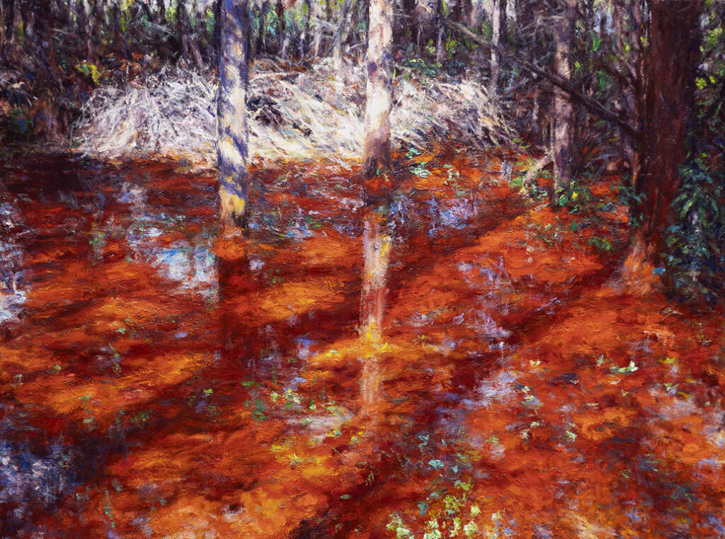 Shimmer Through the WoodsOil on Canvas — 1 Panel 30 inches high BY 40 inches wide each — Installed width = 40 inches
