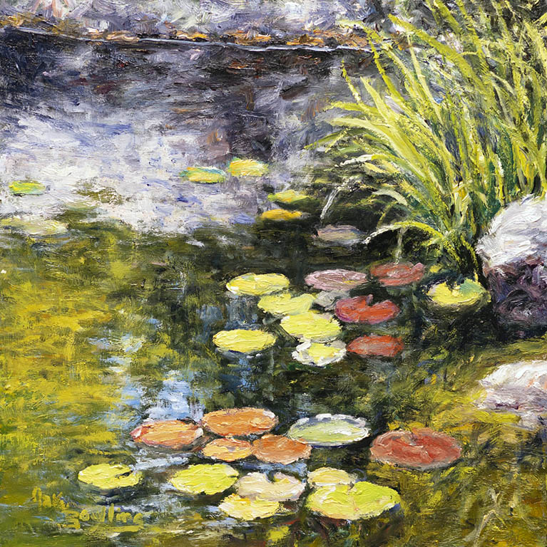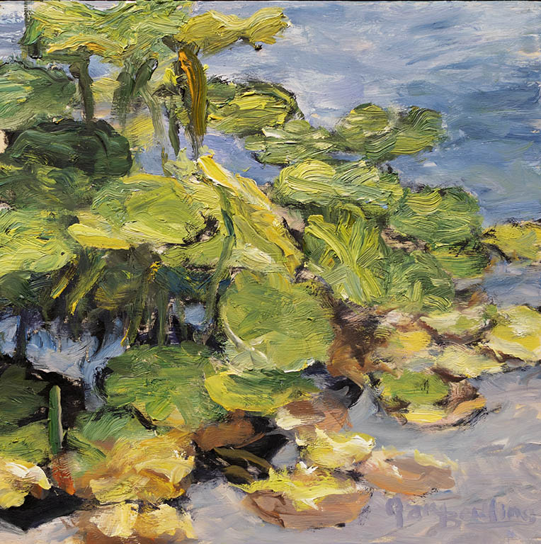 Low Water Lily PadsOil on Panel — 1 Panel 10 inches high BY 10 inches wide each — Installed width = 10 inches